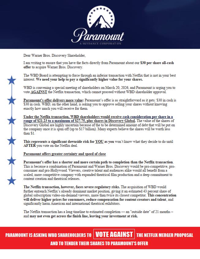 Dear Warner Bros. Discovery Shareholder, I am writing to ensure that you have the facts directly from Paramount about our $30 per share all-cash offer to acquire Warner Bros. Discovery. The WBD Board is attempting to force through an inferior transaction with Netflix that is not in your best interest. We need your help to pay a significantly higher value for your shares. WBD is convening a special meeting of shareholders on March 20, 2026, and Paramount is urging you to vote AGAINST the Netflix transaction, which cannot proceed without WBD shareholder approval. Paramount’s offer delivers more value: Paramount’s offer is as straightforward as it gets: $30 in cash is $30 in cash. WBD, on the other hand, is asking you to approve selling your shares without knowing exactly how much you will receive for them. Under the Netflix transaction, WBD shareholders would receive cash consideration per share in a range of $21.23 to a maximum of $27.75, plus shares in Discovery Global. The value of the shares of Discovery Global are highly uncertain because of the to be determined amount of debt that will be put on the company once it is spun off (up to $17 billion). Many experts believe the shares will be worth less than $1. This represents a significant downside risk for YOU as you won’t know what they decide to do until AFTER you vote on the Netflix deal. Paramount offers greater certainty and speed of close Paramount’s offer has a shorter and more certain path to completion than the Netflix transaction. This is because a combination of Paramount and Warner Bros. Discovery would be pro-competitive, pro- consumer and pro-Hollywood. Viewers, creative talent and audiences alike would all benefit from a scaled, more competitive company with expanded theatrical film production and a deep commitment to content creation and theatrical releases. The Netflix transaction, however, faces severe regulatory risks. The acquisition of WBD would further entrench Netflix’s already dominant market position, giving it an estimated 43 percent share of global subscription video-on-demand viewers, more than twice its closest competitor. This concentration will deliver higher prices for consumers, reduce compensation for content creators and talent, and significantly harm American and international theatrical exhibitors. The Netflix transaction has a long timeline to estimated completion — an "outside date" of 21 months – and may not even get across the finish line, leaving your investment at risk. PARAMOUNT IS ASKING WBD SHAREHOLDERS TO VOTE AGAINST THE NETFLIX MERGER PROPOSAL AND TO TENDER THEIR SHARES TO PARAMOUNT'S OFFER