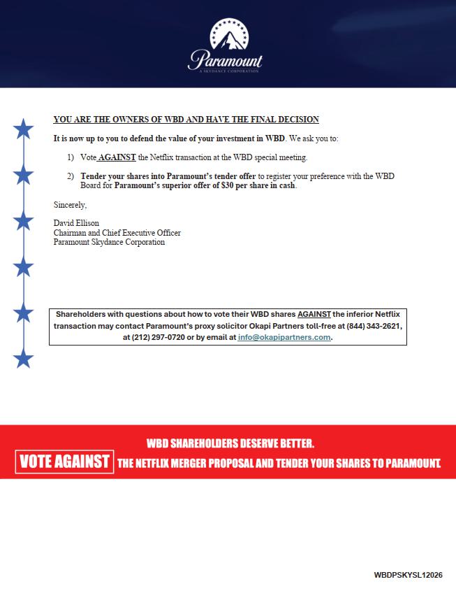 YOU ARE THE OWNERS OF WBD AND HAVE THE FINAL DECISION It is now up to you to defend the value of your investment in WBD. We ask you to: 1) Vote AGAINST the Netflix transaction at the WBD special meeting. 2) Tender your shares into Paramount’s tender offer to register your preference with the WBD Board for Paramount’s superior offer of $30 per share in cash. Sincerely, David Ellison Chairman and Chief Executive Officer Paramount Skydance Corporation Shareholders with questions about how to vote their WBD shares AGAINST the inferior Netflix transaction may contact Paramount’s proxy solicitor Okapi Partners toll-free at (844) 343-2621, at (212) 297-0720 or by email at info@okapipartners.com.WBDPSKYSL12026